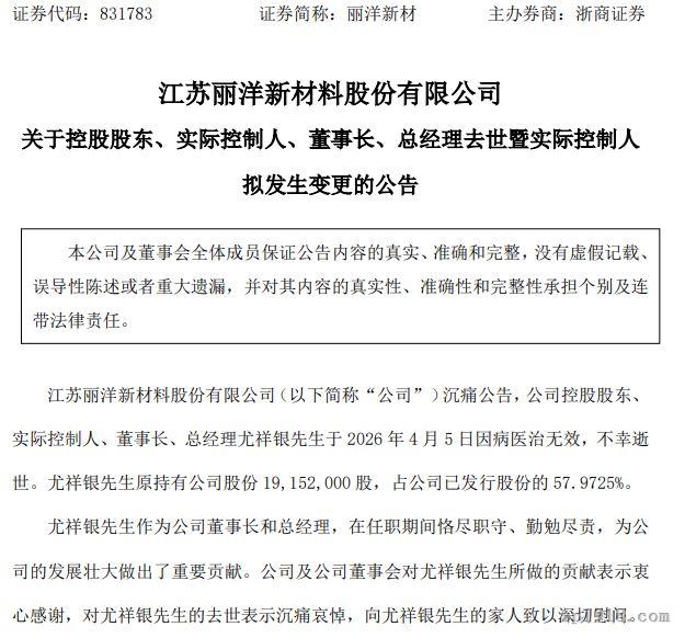 4月8日,新三板掛牌公司麗洋新材(831783)發(fā)布關(guān)于控股股東、實(shí)際控制人、董事長、總經(jīng)理去世暨實(shí)際控制人擬發(fā)生變更的公告。